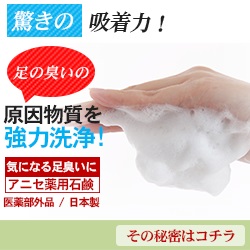 角質や剥がれた皮膚は雑菌のエサとなり雑菌が増殖しますがこの石鹸は古い角質や皮膚を吸着して洗浄する石鹸です。もともと消臭インソールや消臭靴下を販売している会社が開発した足専用の石鹸です。 小学生の息子の足が、靴を履いて蒸れると、ものすごく匂って困っていました。妹に相談したらアニセを紹介され、少しでも効果があればと、さほど期待せずに購入しましたが、期待以上の効果で驚きです。これまで靴を脱いだ後、異臭を放っていた靴下ですが、おそるおそる匂いを嗅いだらほとんど気になりませんでした!本人もとても驚いて、親子とも大満足しています。 |