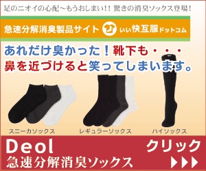 デオル製品は天然の綿素材使用なので肌に優しく汗などの水分に対しても吸水性が高いのが特徴です。臭いのもとが消臭繊維と反応することで化学反応して消臭する仕組みです。多くのメディアでも取り上げられたデオル製品なので効果は期待できます。 お世辞抜きで足の臭いがほとんどしなくなりました。事務仕事で他の社員も一緒なのでずっと気になっていました。気にならない=>汗が減る=>臭いが出にくい=>気にならない |